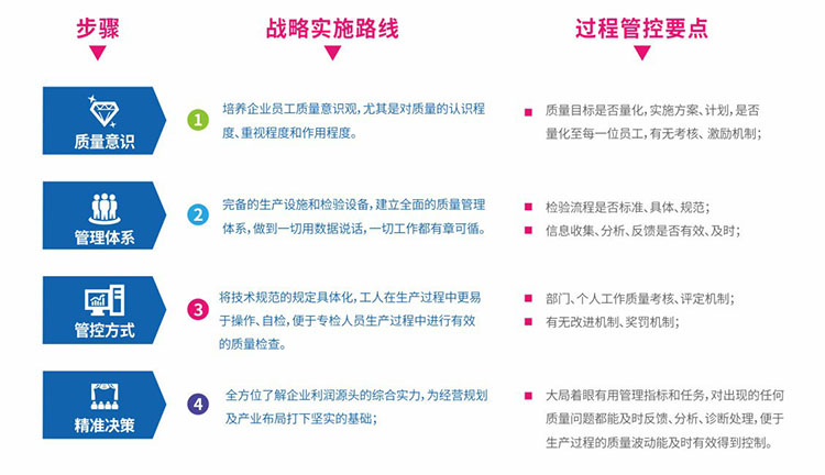 制程管理戰(zhàn)略涵蓋:來料檢驗(yàn)分析、LQC生產(chǎn)檢驗(yàn)缺陷采集、PQC功能測(cè)試缺陷采集、OQC出貨檢驗(yàn)缺陷采集、抽檢加嚴(yán)、DPPM缺陷分析、SPC分析、制程品質(zhì)能力評(píng)估等。